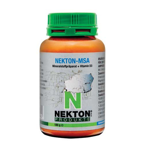 I minerali (oligoelementi) sono sostanze fondamentali e componenti indispensabili per il metabolismo di tutti gli animali, che si trovano nel cibo. Essi devono essere sempre presenti negli alimenti in quanto vengono sempre espulsi dall'animale. È importante somministrare agli animali un buon complesso di minerali, che non è soltanto determinato dal numero e la quantità delle singole sostanze, ma piuttosto dal bilanciamento della sua composizione, indirizzata verso le esigenze corporee degli animali. Questi criteri sono stati presi in considerazione quando è stato creato NEKTON MSA in modo che l’allevatore possa fornire ai suoi animali questi fondamentali elementi nel miglior modo possibile. Nekton MSA non è solubile in acqua, il misurino NEKTON all’interno della confezione corrisponde a 1,5g. Si consiglia di utilizzare Nekton MSA nella misura di 1,5g (1 misurino) di KEKTON-MSA in 100g di pastoncino al giorno per 3-4 giorni a settimana o se preferite potete metterlo direttamente nell’unghietta portasali o miscelato al grit.
