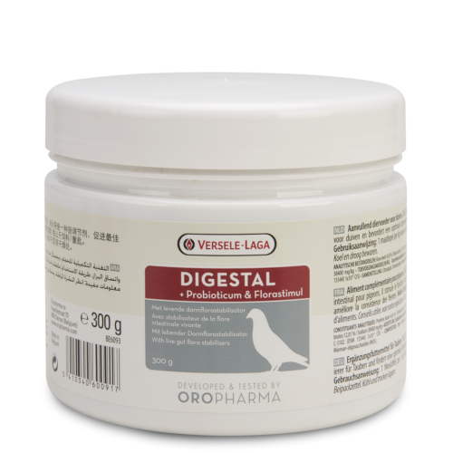 Questo complemento alimentare migliora la condizione degli intestini grazie alla presenza di probiotici. Oropharma Digestal ripristina le funzioni della flora naturalmente presente nell'intestino, inibendo la crescita dei batteri patogeni. Nell'apparato digerente dei colombi sono presenti batteri essenziali a una buona digestione. Tali batteri benigni sono predominanti negli animali sani. Se invece sono i batteri patogeni a essere in maggioranza, il colombo presenta escrementi acquosi, con una conseguente perdita ingente di fluidi ed elettroliti. La somministrazione di antibiotici uccide sia i batteri buoni che quelli patogeni. Digestal funge da alimento per la flora intestinale buona (probiotici) e assicura che i batteri patogeni non riescano più ad aderire alle pareti intestinali, di modo che la flora naturale dell'intestino possa ristabilirsi.